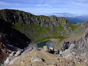 焼岳北峰山頂からの火口湖・右奥に御嶽山も見える |