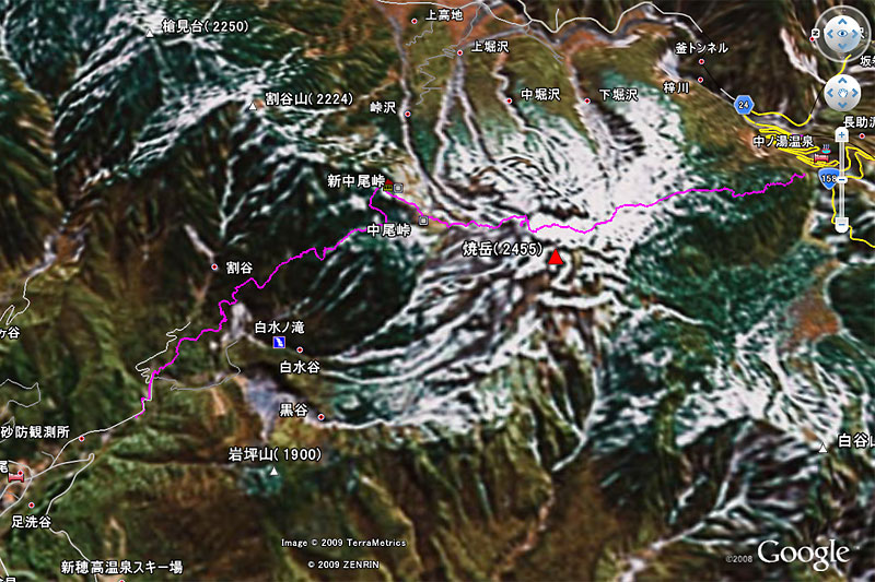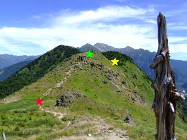 赤・中尾峠 青・展望台 黄・焼岳小屋 |