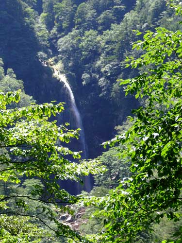 白水ノ滝ビューポイント 岩肌が温泉成分で茶色になっている |