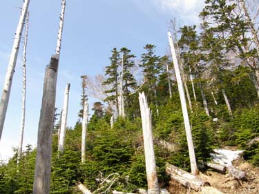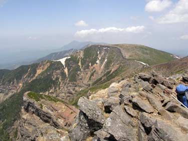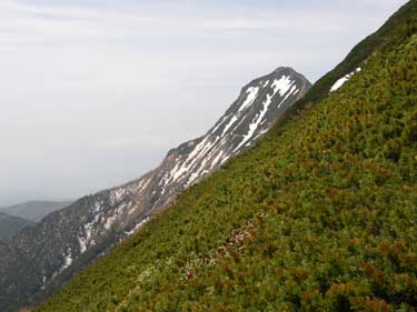 三叉峰直下のハイマツ帯から望む赤岳 |