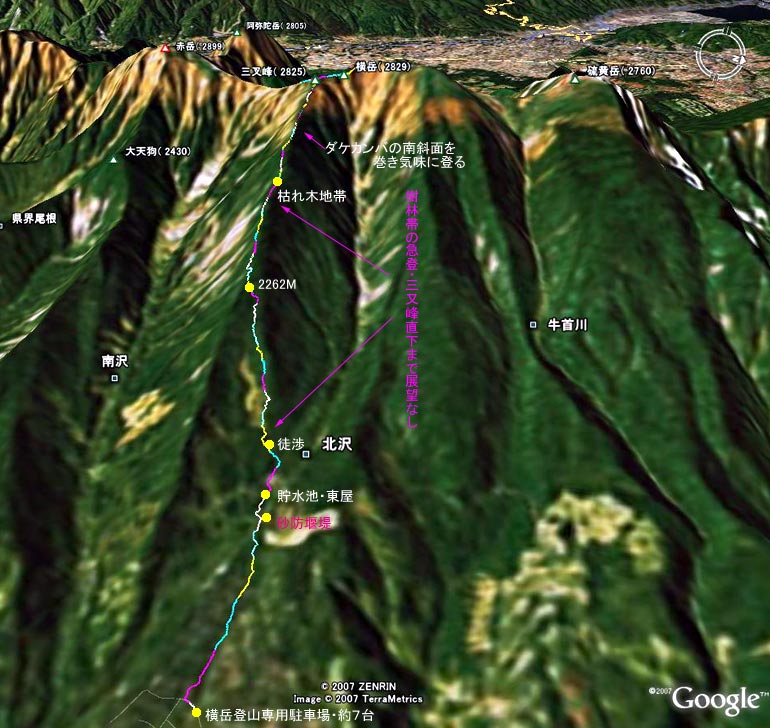 別荘地を抜けて北沢に出る ⇔ 砂防堰堤を渡る |