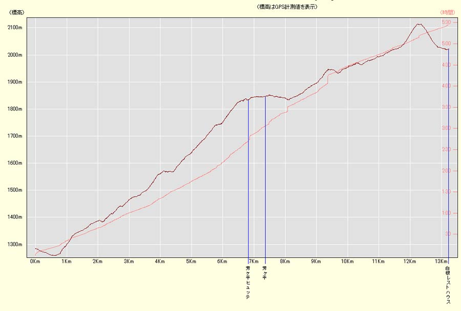駐車場標高/1250M(最低標高 1200M) 標高差/900M 総歩行距離/13244M |