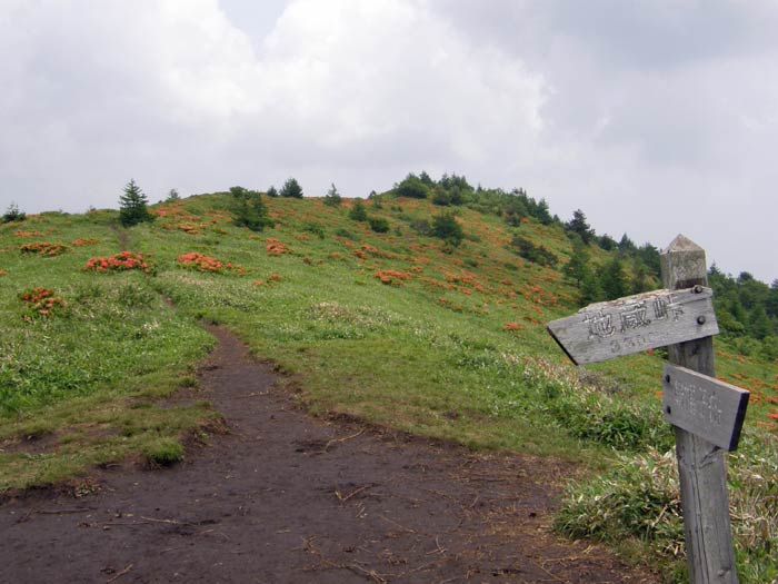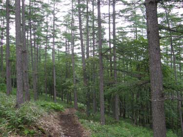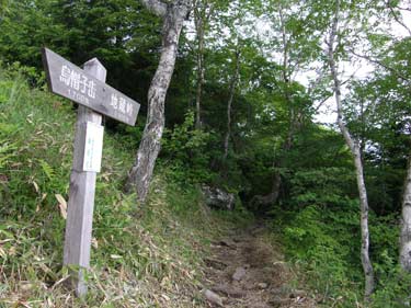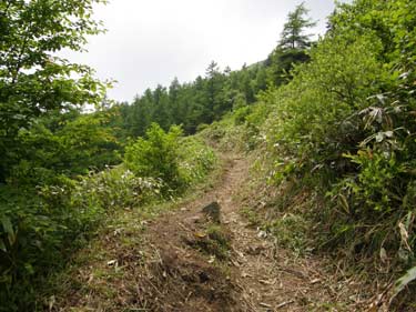 一本道だが所々に指導標がたつ | ツツジ平分岐点から唐松林を緩く下る | |||