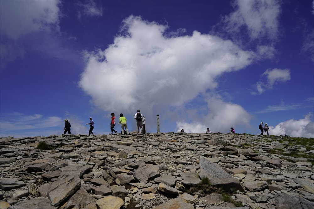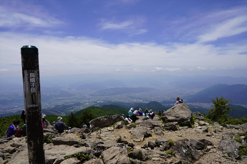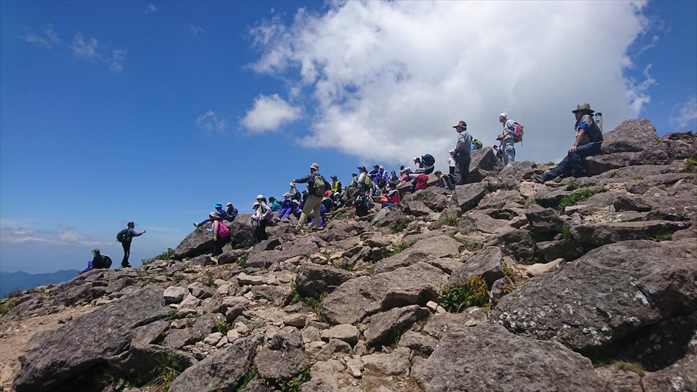 長野県名物(小・中・高校)学校登山の小学生達で烏帽子岳山頂は大賑わい ※学校で待機する校長先生と鏡でピカピカ通信をしていたので我が母校の小学生かも・・・ |